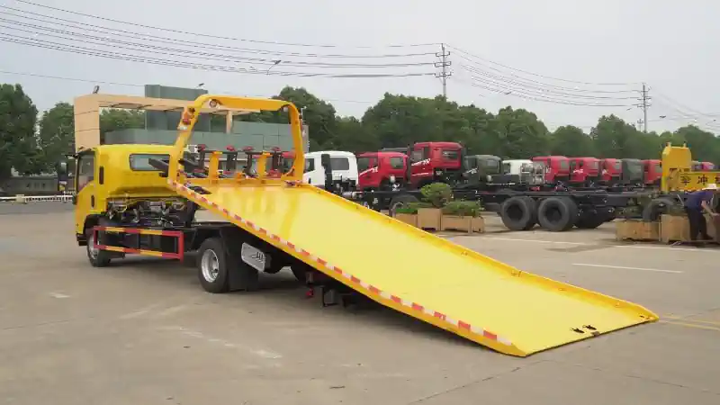 190HP Isuzu-powered road rescue tow truck, 5-ton superstructure 6.5×2.4m flatbed one-tow-two wrecker truck, 5mm thick integrated pattern plate bilateral linkage operation wrecker, Company standard 5-ton superstructure Isuzu chassis wrecker, Flip-up cab 23575R17.5 tire ABS air brake wrecker truck, Isuzu 190HP 4475mm wheelbase wrecker, Isuzu MLD 6-speed transmission 4-ton front 7-ton rear axle wrecker, L-type tire holders 4 binding straps heavy-duty recovery wrecker, Nohva 40KN hydraulic winch 21m steel wire rope rescue truck, Power steering central locking power windows comfort config wrecker